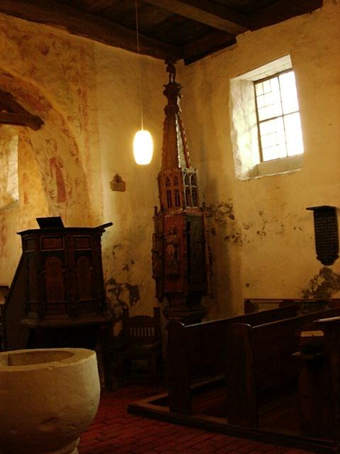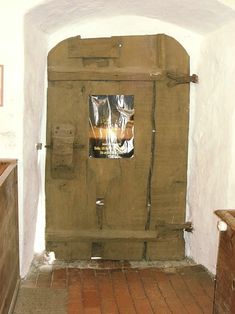 Wer die Kirche betritt, schreitet durch eine große, schwere, hölzerne Tür . Es ist die