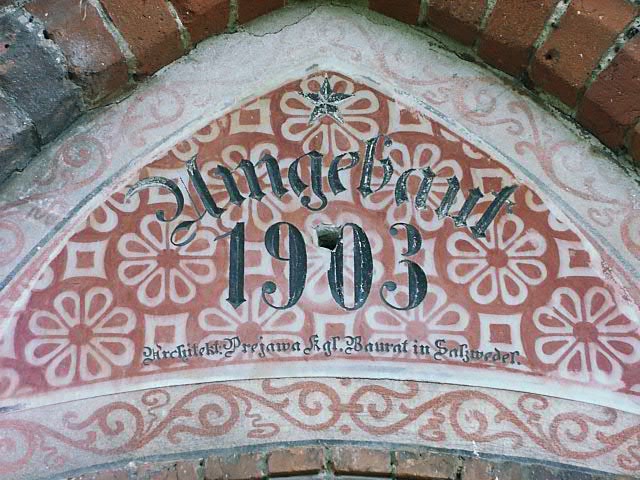Bild 5: Über dem Haupteingang der neuen Kirche: Umgebaut 1903, Architekt Prejawa Kgl. Baurat in Salzwedel